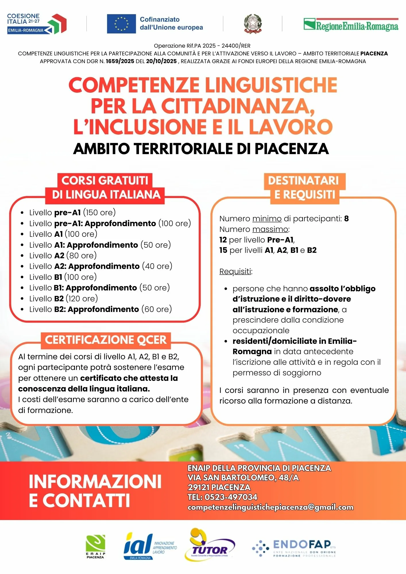 E’ in essere la realizzazione di percorsi gratuiti finalizzati ad accrescere le competenze linguistiche, finanziati dal FSE PLUS 2021-2027 della Regione Emilia-Romagna attraverso lezioni in presenza e a distanza.